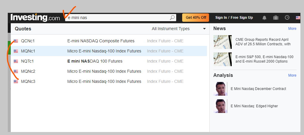 아래 링크를 타고 접속하셔서 검색창에 'e-mini nasdaq'이라고 검색하면 뜨는 리스트들이 있습니다.