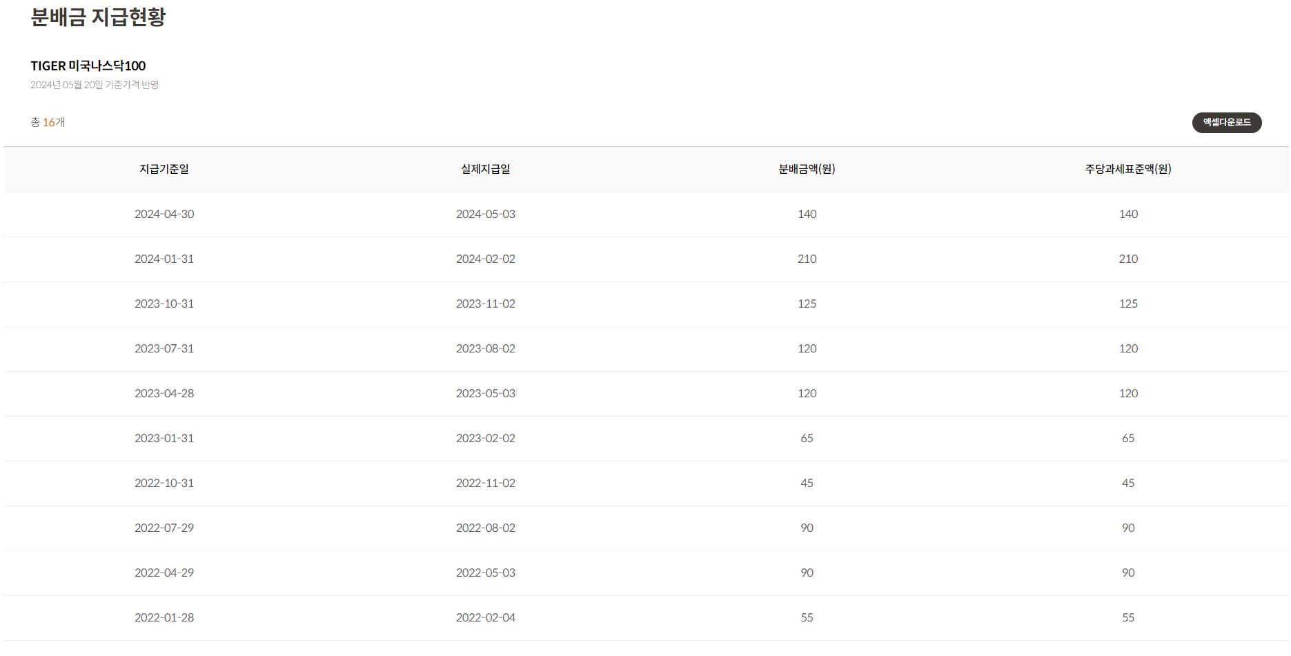 지금 위의 내용에서 유추해볼 때, 타이거 나스닥100 배당 지급 주기는 3개월 간격이며, 1,4,7,10월이 지급기준일이고, 각월 그 다음달 초 2,5,8,11월 초에 지급 된다는 것을 알 수 있습니다.