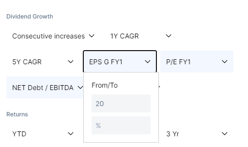 1)에서 설정된 시장규모의 기업들 중에서 순이익이 1년 동안 20% 성장한 기업들이 추려지게 됩니다.