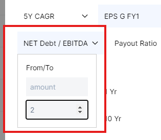 전체 EBITDA (기업의 벨류) 중에서 부채가 차지하는 비율입니다. 보통 이 값이 2보다 낮은 경우, 상당히 좋은 재무상태를 가진 기업이라고 볼 수 있습니다. 그래서 조건에 추가해 줍니다.