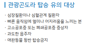 - 안전 수칙 준수: 곤도라 탑승 시 안내에 따라 움직이고, 창문 밖으로 손이나 물건을 내밀지 않도록 주의해야 해요.