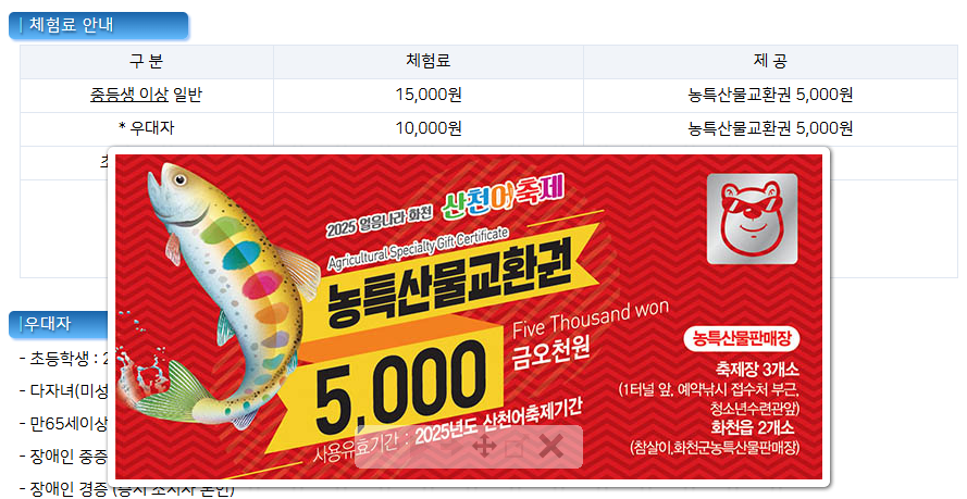 - 중학생 이상: 15,000원 (농특산물 교환권 5,000원 포함)